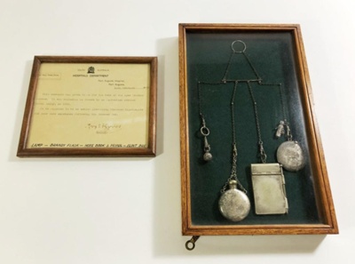About this objectChatelaine given to Matron Mary E Fitzgerald of the Port Augusta Hospital for the Home of the Aged Trained Nurses, 14th February 1958. The items were collected in France by an Australian Soldier named Kelly, in 1920. It consists of four silver coloured metal items attached to a metal chain. The items are described as: a lamp, a brandy flask, a note book & pencil and a flint box. According to the associated framed letter "it is supposed to be an emblem glorifying Florence Nightingale and came into existence following the Crimean War."