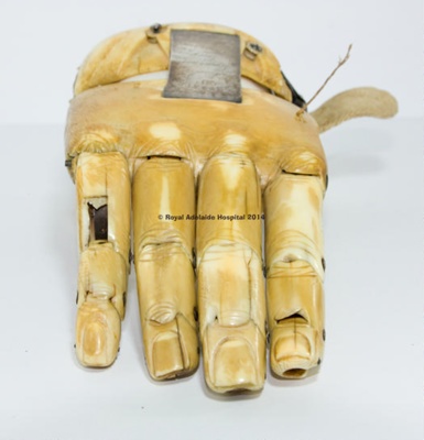 Robert Hasting Norman, Surgeon Dentist, arrived in Adelaide in 1844, establishing the colony’s first dental practice in Wright Street. A learned gentleman, Robert Norman also carved objects from ivory and bone, exploring mechanical applications with his craft. Governor Grey sponsored the construction of a prosthetic hand by Robert Norman for John Coles. An engraved silver plaque, ‘Presented by His Excellency Governor Grey - Robert Norman Inventor’, is attached to the prosthetic hand. The plaque does not impede on the functionality of the hand. John Coles used the prosthetic hand until his death 1886. Made out of whalebone, it has four fingers and is operated using strings and pulleys. The fingers are flexed by contracting the strings which are connected to a ring on the remaining thumb.