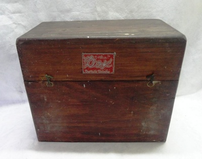 About this objectWood box with hinged lid, metal label nailed to front near clasps ‘DOX denture grinder’. The equipment inside is enamelled cream and polished steel apparatus for "grinding in" a set of opposing dentures. A red painted metal tag reads ‘The improved DOX denture grinder’.
