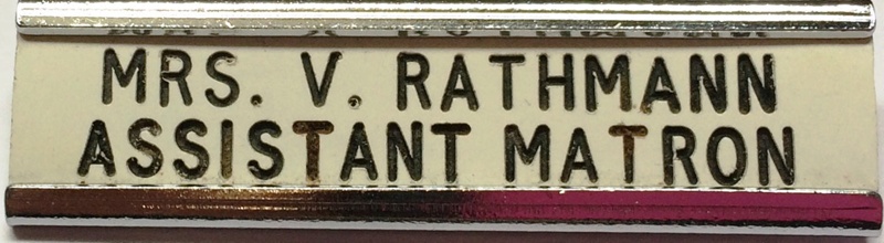 About this object"Mrs V Rathmann Assistant Matron" name bar badge. Silver metal surround with white background and black lettering.