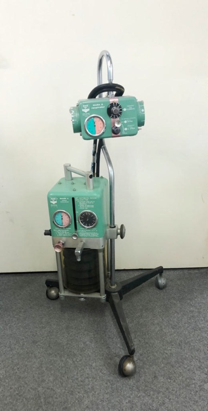 About this objectThis exhibit has been set up as an anaesthesia ventilator by combining a Bird Mark 8 Ventilator with a Bird Mark 4 transfer unit. The later consists of a concertina bag in a rigid container. During inspiration, the Mark 8 forces gas into the rigid box thus compressing the contained bag. This bag is connected to the anaesthetic circuit and thus contains anaesthetic gases which inflate the lungs when the bag is compressed. Thus an inspirtion is started and continues until either a preset airway pressure is reached (pressure cycled) or a preset volume (volume cycled) has entered the lungs. The patient then expires spontaniously. The Mark 8 can also be made to generate a negative pressure during expiration and may be used when the operator feels that this function may assist the patient.